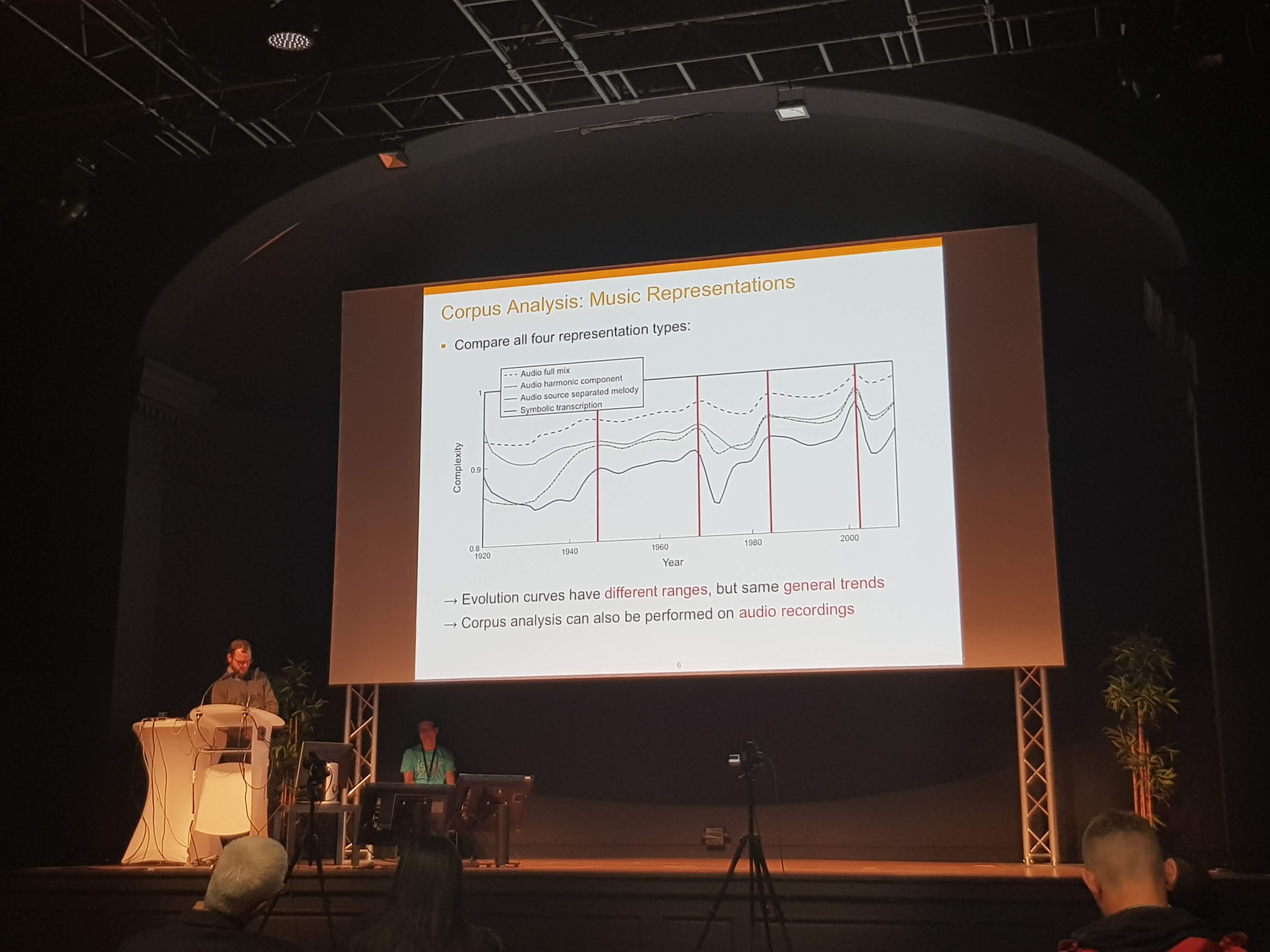 Linked Open Data was also very present, and I enjoyed the work of Pasquale Lisena and his colleagues in DOREMUS on integrating vocabularies for musical datasets. There is a great opportunity here to bring further integration into symbolic music representations, mixing scores, MIDI files, MusicXML, MEI and metadata databases. The work on OpenMIC and Julie Cumming et al. also made fundamental points to me (especially considering my Semantic Web background) on methodologies for encoding and integrating symbolic corpora –this is way more challenging than one could expect from the outside, as different encodings cover different parts of notation, there’s lots of ambiguity, and systematic methods and tools need further work.